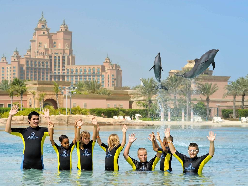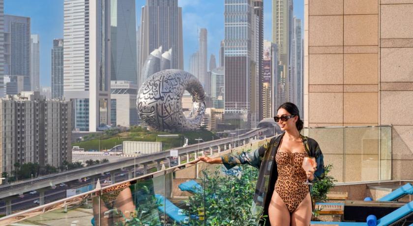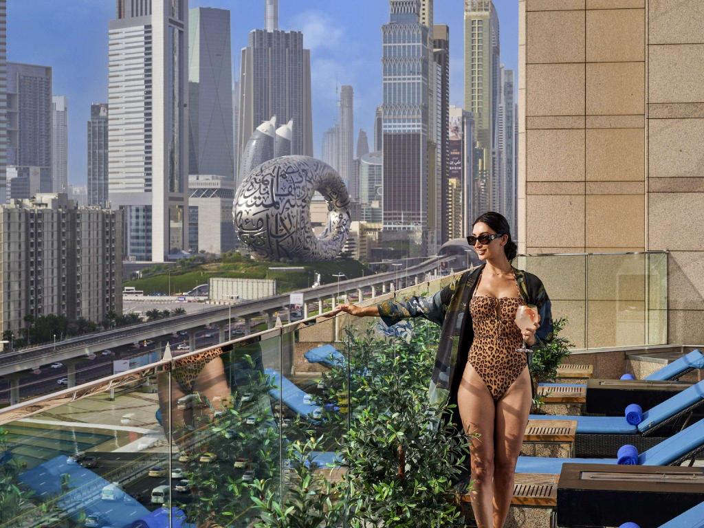 Imagery includes high-rise exteriors, sophisticated room interiors, rooftop pools, refined dining areas, and spa facilities that reflect the lifestyle of luxury and calm amid Dubai’s energy.